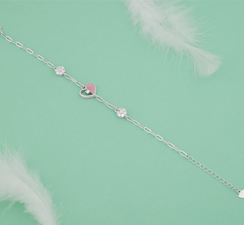 Show your playful side with this 925 Sterling Silver Bracelet, featuring a charming heart-shaped centerpiece adorned with soft pink enamel and a sparkling cubic zirconia accent. Two glittering zircon clusters add brilliance to the modern open-link chain, making this bracelet the perfect balance of romance and elegance. Crafted for comfort and long-lasting shine, it’s hypoallergenic and tarnish-resistant, ideal for daily wear or gifting.