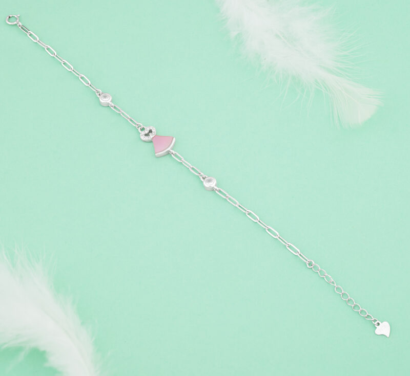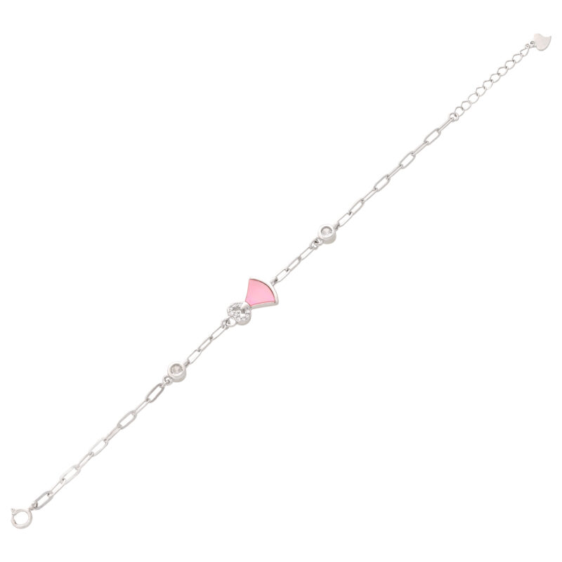 Elevate your style with this 925 Sterling Silver Bracelet, featuring a chic fan-shaped charm in soft pink enamel, accented with dazzling cubic zirconia. The contemporary open-link chain design adds a touch of modern elegance, making it perfect for everyday wear or special occasions. Crafted for comfort and durability, this bracelet is hypoallergenic and designed to maintain its shine for years to come.