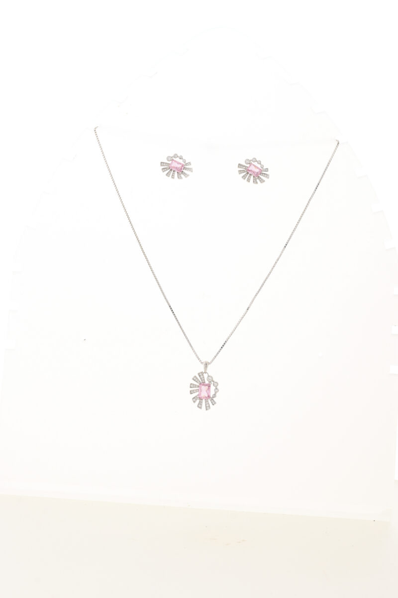 Add a pop of color and sparkle to your collection with this 925 Sterling Silver Jewelry Set, featuring a matching pendant necklace and stud earrings. The focal point is a stunning pink baguette-cut stone, set in a fan-inspired geometric frame embellished with dazzling white zircons. Whether worn as a set or styled separately, this design blends vintage charm with a modern flair. Made from high-quality sterling silver, this set is hypoallergenic, lightweight, and ideal for everyday wear or special occasions.