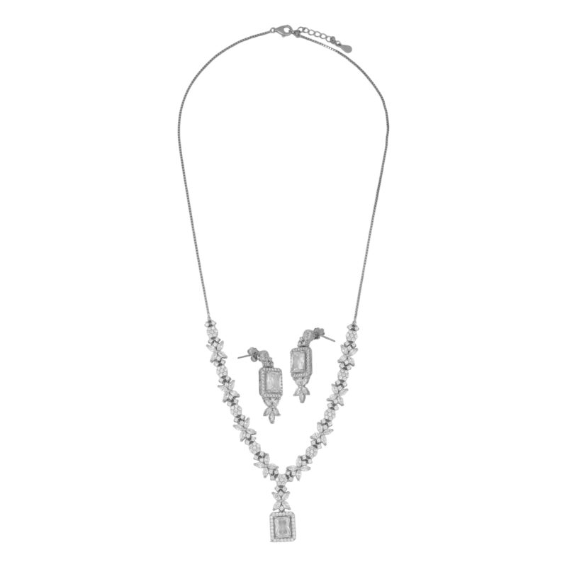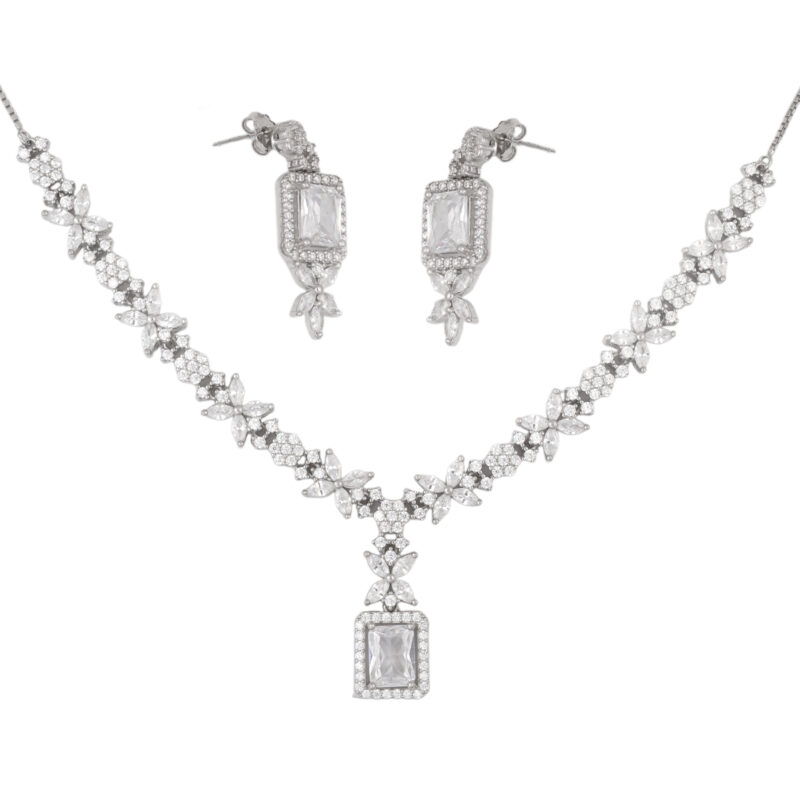 Make an unforgettable entrance with this exquisite Statement Necklace and Earrings Set, designed to bring bridal glamour and red carpet sparkle to any special occasion. The set features a dazzling necklace adorned with intricate floral motifs and a central emerald-cut cubic zirconia pendant, perfectly matched with coordinating drop earrings.