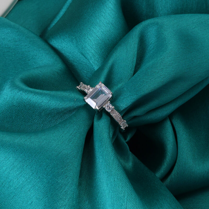 Elevate your elegance with this Classic Emerald Cut CZ Sterling Silver Ring. The striking emerald-cut cubic zirconia (CZ) stone is the centerpiece of this refined design, surrounded by delicate pavé-set CZ stones along the band for added sparkle.
